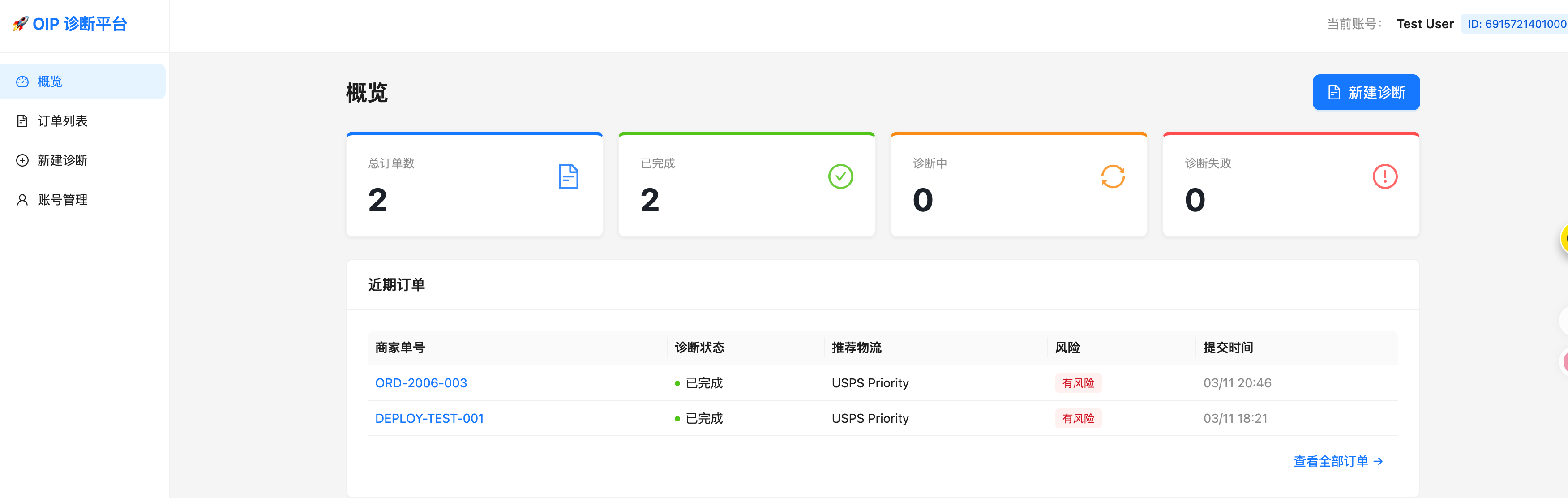 系统包含四个模块:概览、订单列表、新建诊断、账号管理。